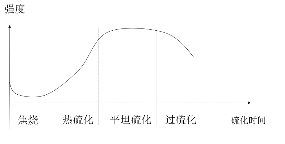 橡胶的性能随硫化时间的增加而变化,橡胶的硫化历程可分为四个阶段:焦烧阶段、热硫化阶段、平坦硫化阶段,过硫化阶段。